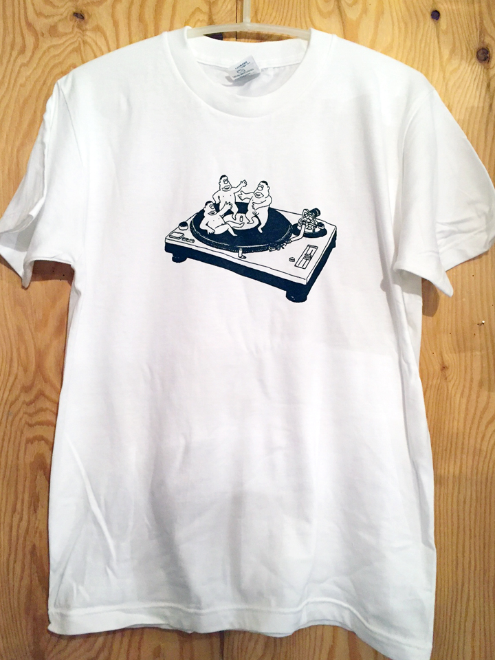 五木田智央/コンピューマ/ヤマベケイジのトリプル・オヤGを中心に、10年以上前から不定期に開催している極地的飲ん兵衛・爆裂パーティー「GOLD DAMAGE」のスペシャル会として2015年の春に開催した「GOLD DAMAGEヌード」の、五木田智央本人が全て手描きしてデザインしてコピー印刷までして作成してくれたフライヤーのアートワークを抜擢!Tシャツにしてみましたっ!!! ターンテーブルの上で仲良く戯れる素っ裸のオヤG達がカワユイ(?)でしょっ!!! 今年の夏は是非ともコレを着て、オヤG達と一緒に戯れましょう〜。