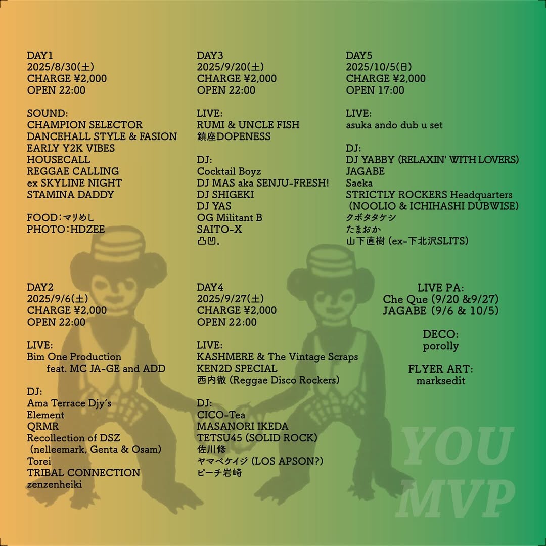 4日目の9月27日(土)は、カシミア&ヴィンテージ・スクラップス、KEN2D SPECIAL、Reggae Disco Rockersや坂本慎太郎BAND等で活躍するサックス&フルート奏者の西内徹ソロの3組のライブに、虎子でDJするのは前回から11年ぶりとなる私ヤマベも、池田正典さんや佐川修さんやピーチ岩崎等と一緒に盛り上げます!