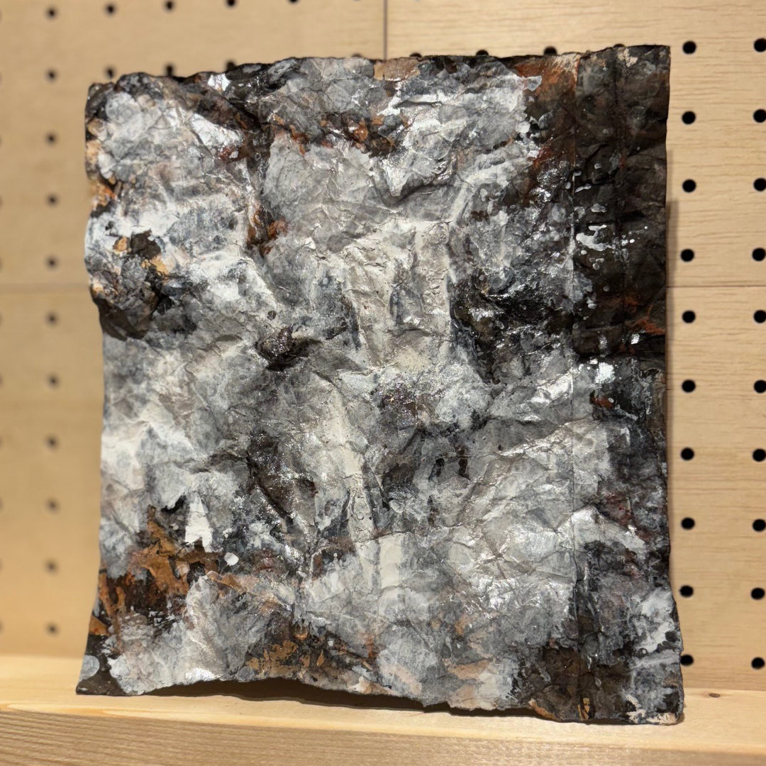 筆のタッチ感や痕跡は埋もれ、ファウンドアート的様相を纏ったペインティングとなっております。